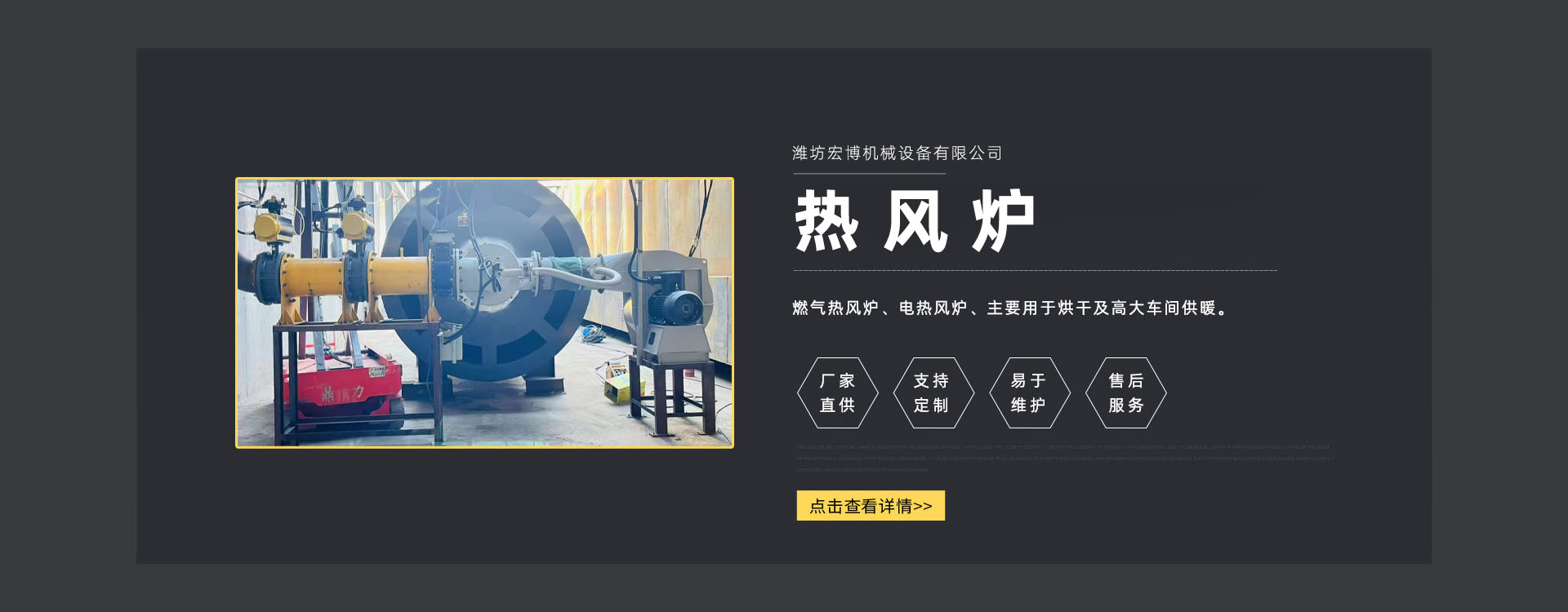 濰坊宏博機(jī)(jī)械設(shè)(shè)備有限公司是從事熱風(fēng)(fēng)爐、烘干設(shè)(shè)備、供暖設(shè)(shè)備的研發(fā)(fā)、設(shè)(shè)計(jì)(jì)、制造和服務(wù)(wù)于一體的實(shí)(shí)體企業(yè)(yè)。長(zhǎng)(zhǎng)期以來(lái),企業(yè)(yè)以市場(chǎng)(chǎng)的發(fā)(fā)展和客戶的需求為導(dǎo)(dǎo)向,集多年的生產(chǎn)(chǎn)技術(shù)(shù)與經(jīng)(jīng)驗(yàn)(yàn)為一體,不斷開發(fā)(fā)和優(yōu)(yōu)良產(chǎn)(chǎn)品。